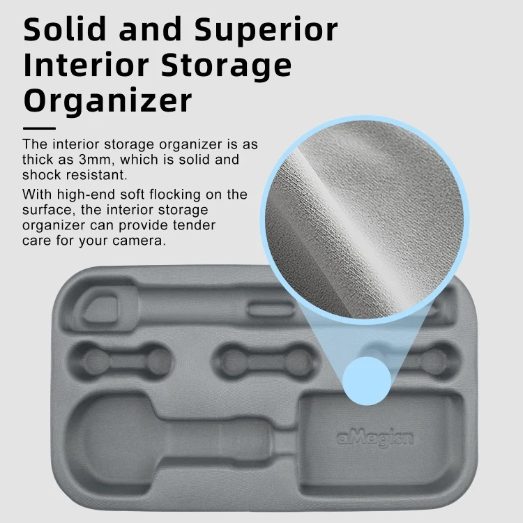 3. The thermoformed inner support has moderately tight slots to keep items in place. It is shockproof and anti-fall, and the flexible surface fabric protects your camera.