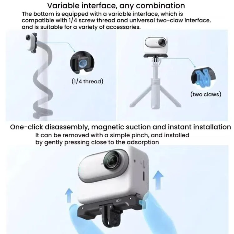 2. The bottom is equipped with a variable interface, compatible with 1/4 screw port and universal two-claw interface, suitable for a variety of accessories