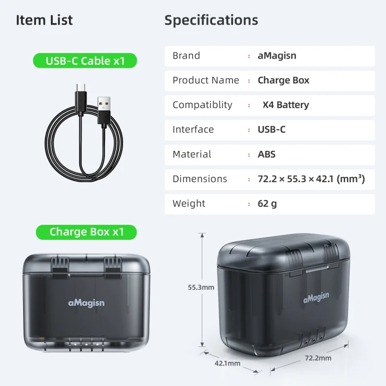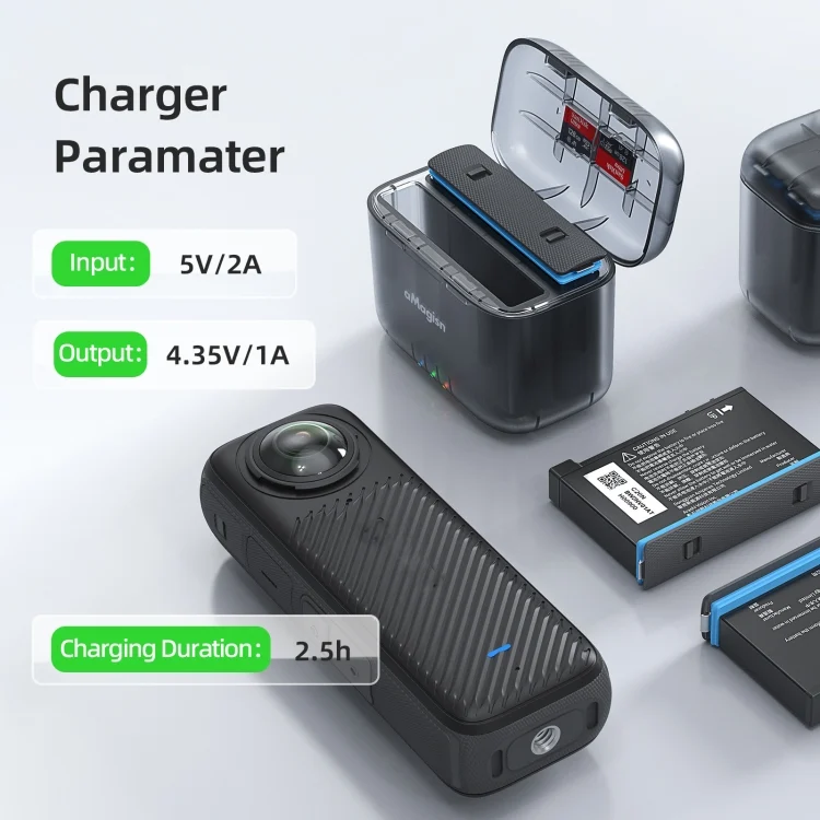 For Insta360 X4 AMagisn Dual Battery Charging Box Transparent Battery Storage Compartment
