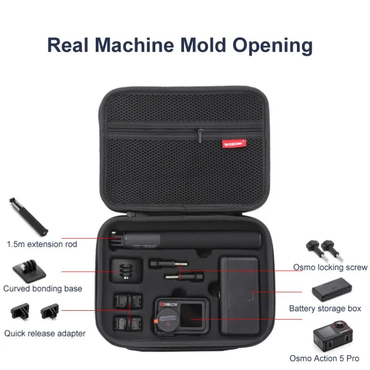 4. Spacious and Organized Storage: Accommodates the camera, a 1.5-meter extension rod, Osmo lock screw, curved adhesive base, multi-functional battery case, quick-release adapter, and accessories like chargers, cables, and lens caps in its mesh pocket.