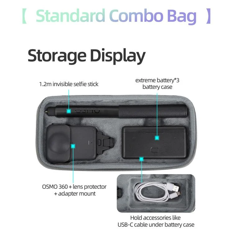 1. Adventure combo bag can hold OSMO 360, lens cover, adapter mount, three extreme batteries, 1.2m invisible selfie stick and other camera accessories.