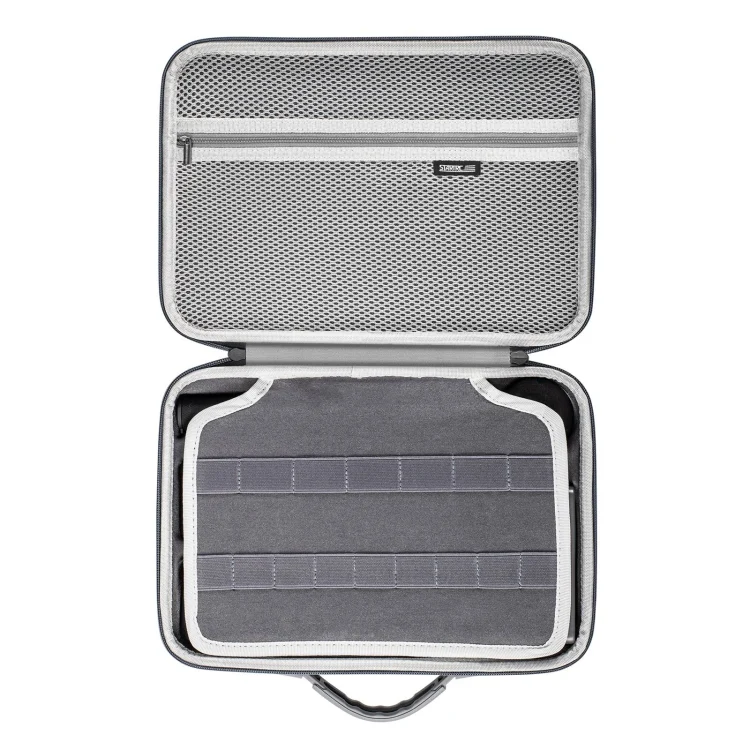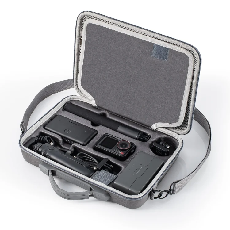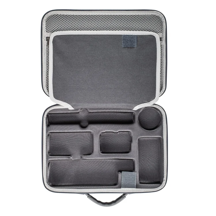 1. Large storage capacity. It can store Action 5 pro camera, extension rod, charging case, multi-function handle, mic2 and expansion parts for daily storage and protection. It also has custom positions for quick-release parts, adapter brackets and spring belt design of the interleaf board, which is enough to store filters, memory cards and data. The upper web pocket can hold some idle belongings, such as wires and data cables.