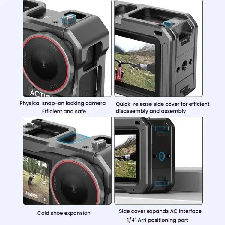 1. Rich external holes, with 1/4 inch Arri positioning hole, cold shoe interface, Action quick release interface, etc.