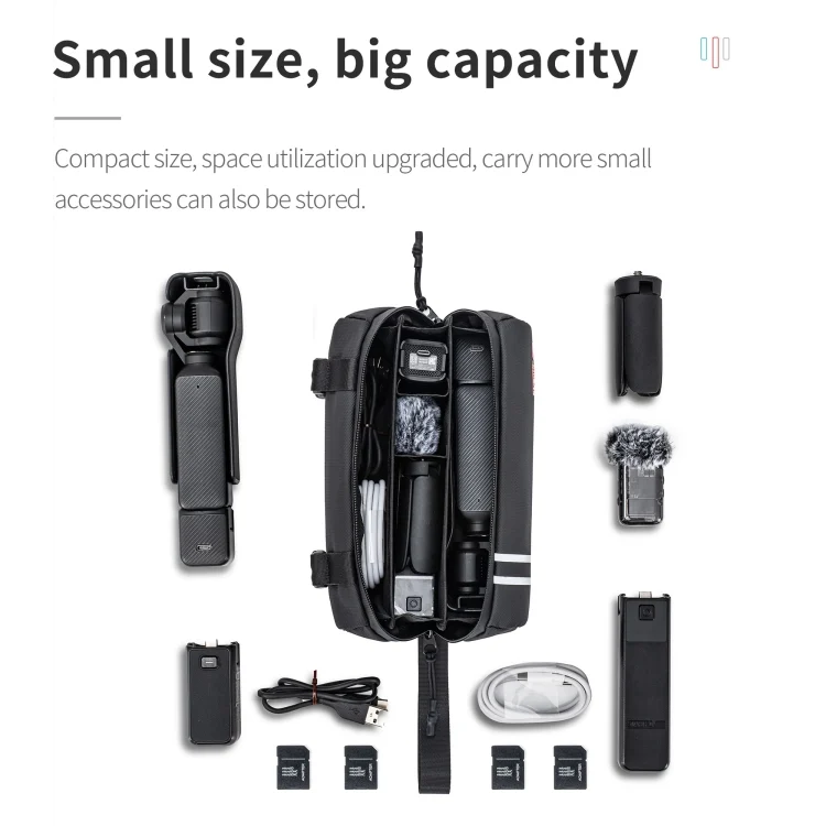 1. Exclusive design. Designed for Pocket 3 all-around set, also suitable for vlog set, it can hold Pocket 3 with original protective case, microphone, mini tripod, endurance handle, STARTRC exclusive designed P3 power bank, compatible with Mic2 charging box, data cable, SD card, memory card, etc.;