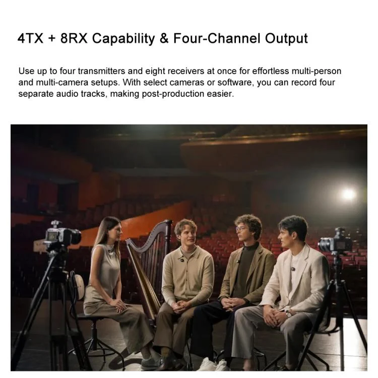 3. 4TX + 8RX Capability & Four-Channel Output: Use up to four transmitters and eight receivers at once for effortless multi-person and multi-camera setups. With select cameras or software, you can record four separate audio tracks, making post-production easier.