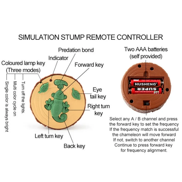 6. Power supply: 2 x AAA batteries for remote control, 4 x AA batteries for the chameleon (not included)