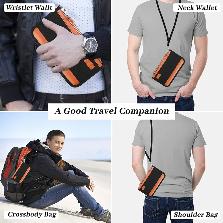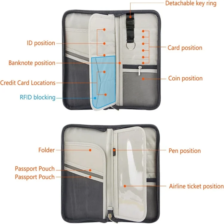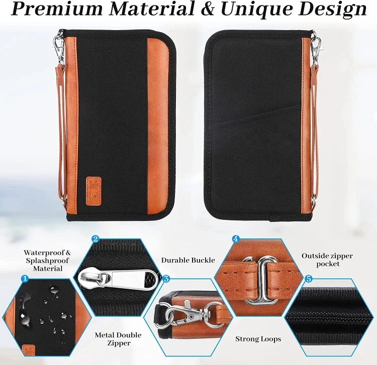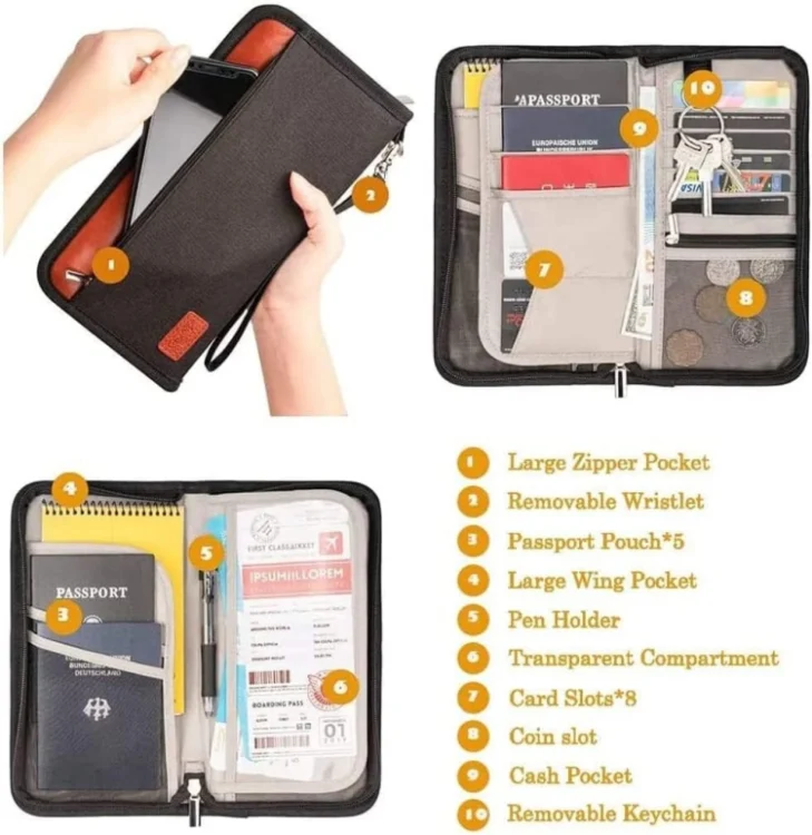 2. Large capacity, can hold 5 passports, 8 card slots, 1 coin zipper mesh pocket, 1 ID/photo transparent slot, 1 cash/document large deep back pocket, 1 key hook