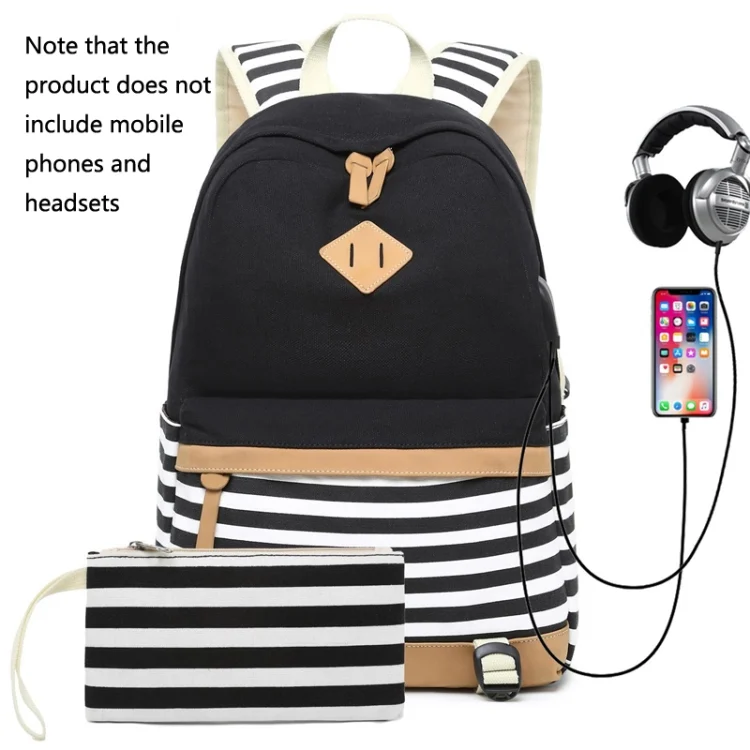 2 PCS/Set Printed Canvas Backpack Student School Bag Striped Large Capacity Backpack
