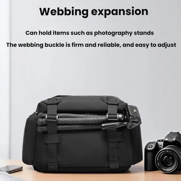 4. Expandable webbing straps accommodate items like a camera stand, with secure, adjustable buckles