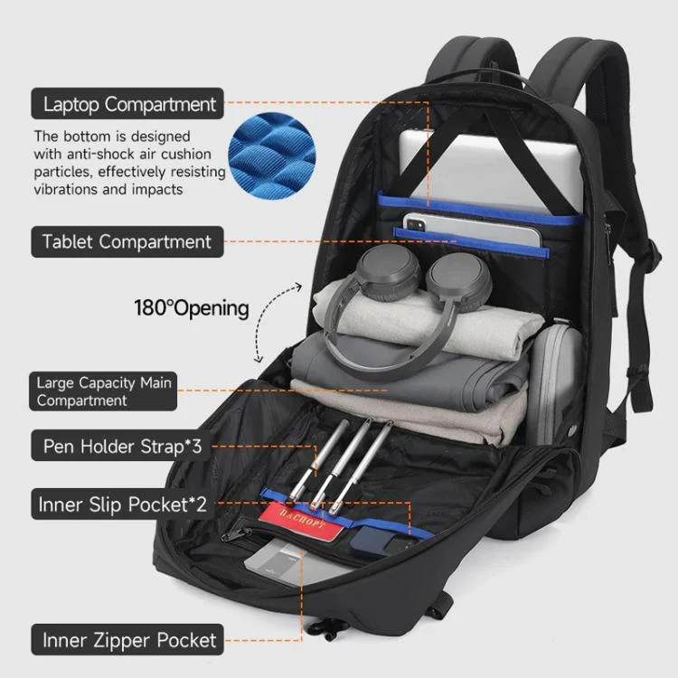 2. The backpack is equipped with compartments for laptops and tablets, and the bottom is designed with shock-absorbing air cushion particles to effectively resist vibrations and impacts. The phone pocket can hold a phone, data cable and charger. The crossbody bag can hold daily toiletries. The two front pockets can be detached downward for easier access to items. The hidden side mesh pocket can hold a cup or umbrella. When the mesh is closed, it naturally integrates with the side of the backpack, providing practical storage space and a clean, smooth appearance.