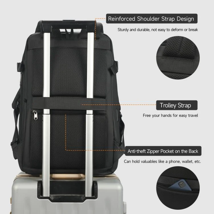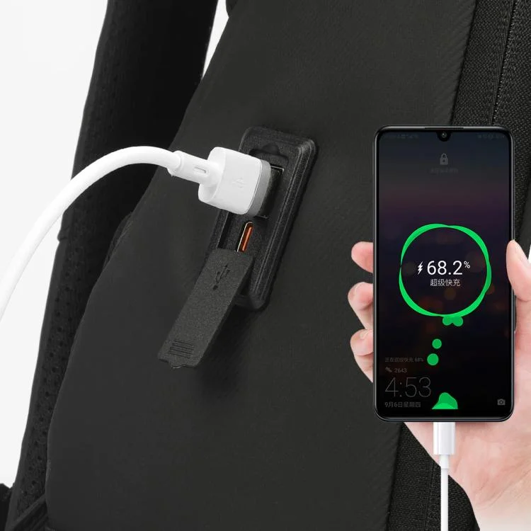 4. The backpack is equipped with an internal charging cable and an external charging port, allowing you to connect your phone charger to the charging cable inside the backpack for charging.