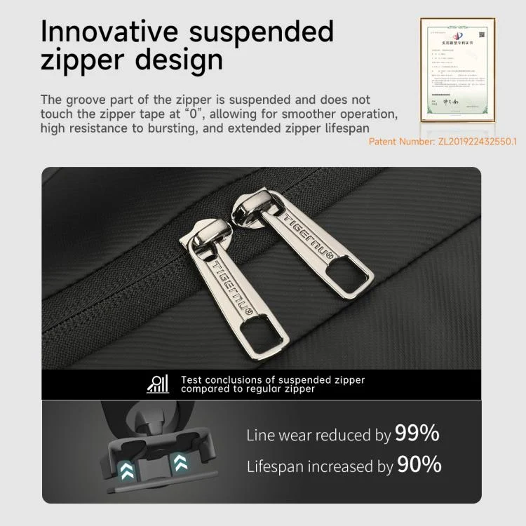7. Tigernu floating zipper design experience original research and development technology. Through ingenious structural engineering, the groove puller and zipper achieve “0” contact, reducing the direct friction between the traditional puller and zipper, and extending the service life of the zipper.