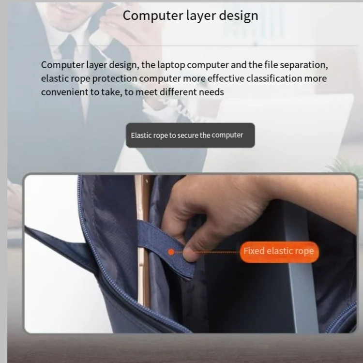 3. Computer compartment design (sponge inside for shock absorption), which separates the laptop from the documents, with elastic rope protection