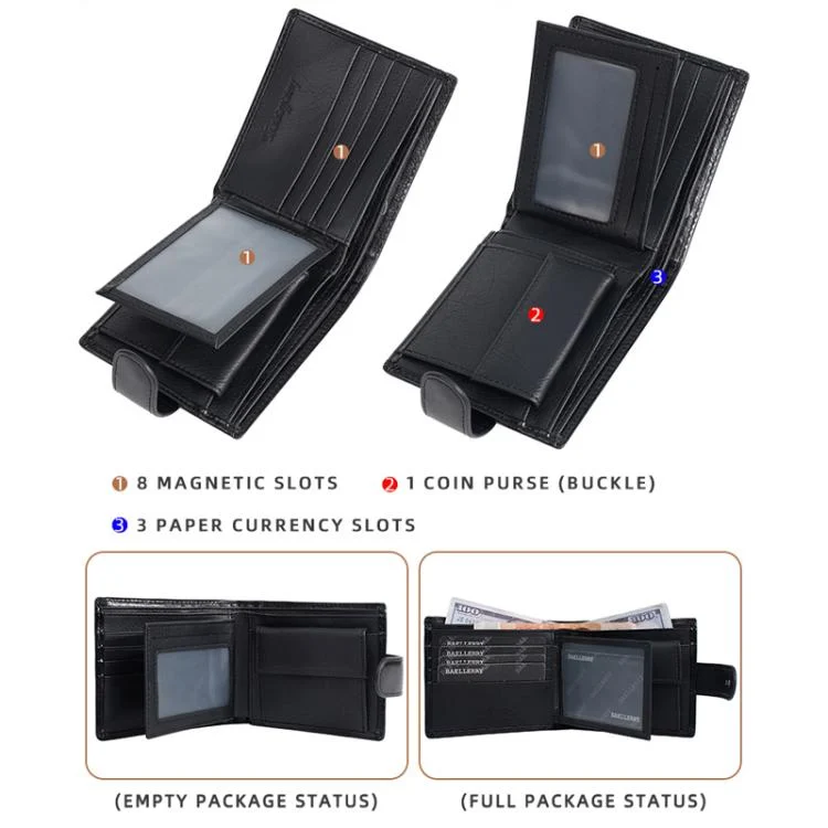 3. 8 magnetic slots, 1 coin wallet (with buckle), 3 bill slots