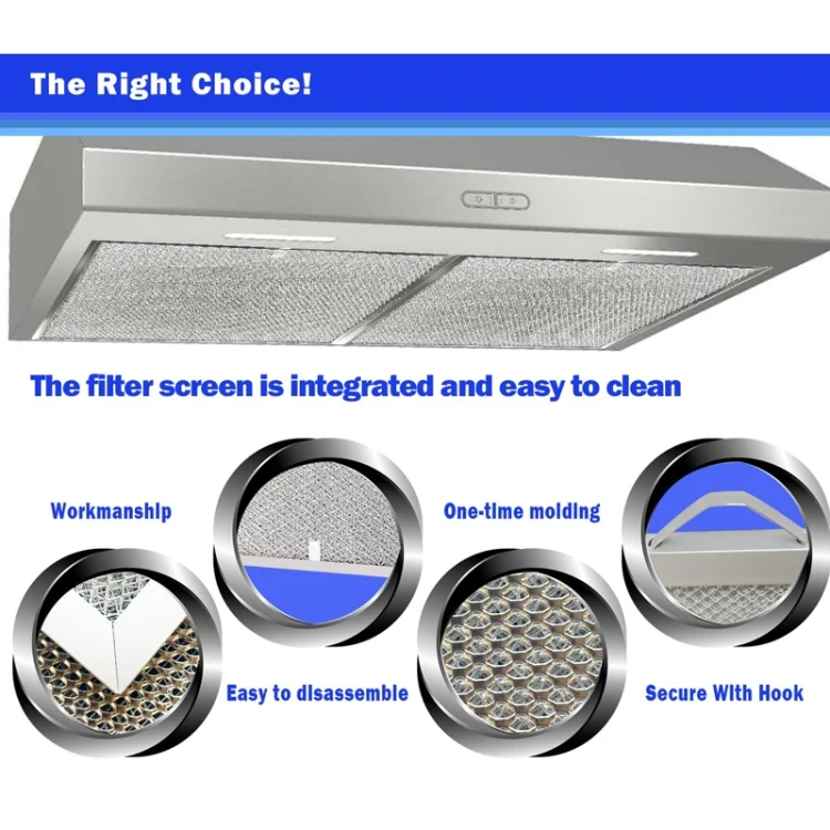 3. The kitchen exhaust fan filter is installed under the range hood, above the stove top, facing downward. It is recommended to hand wash the filter with mild dishwashing liquid and warm water. Soak the filter in hot water and dishwashing liquid for about 1 hour. Then use a fine-bristled brush to gently scrub the surface of the filter. Rinse with water and dry.