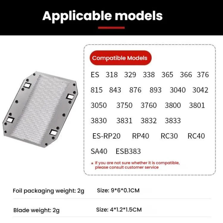 1. Suitable for Panasonic shaver foil/blades, applicable models: ES318 329, 338, 365, 366, 376,815, 843, 876, 893 3040, 3042, 3050, 3750, 3760, 3800, 3801,3830, 3831, 3832, 3833, ES-RP20, RP40, RC30, RC40, SA40, ESB383