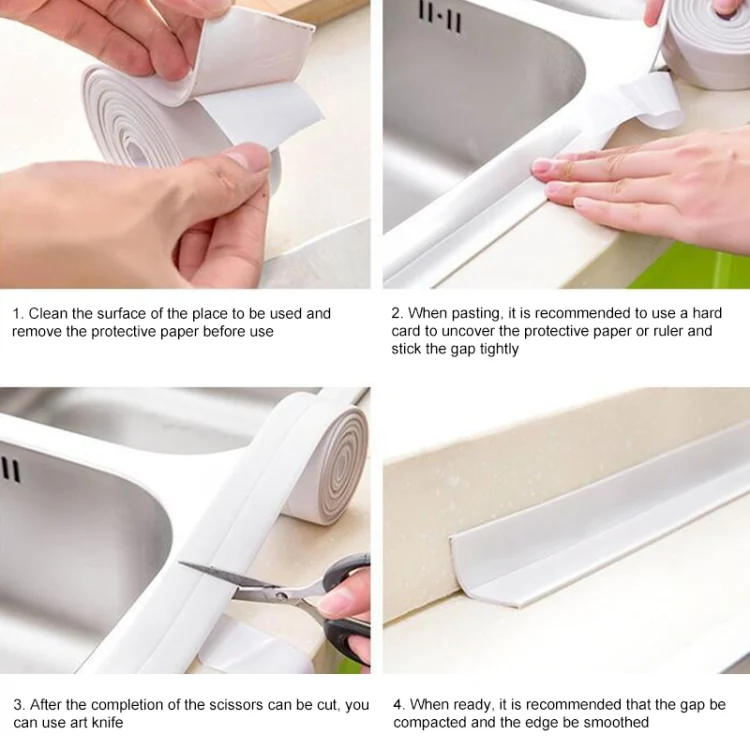 6. Note: The tape is usually used for seam crossing between sink and table, wall and table, it is not recommended used on the seam crossing between wall and floor, before you use the tape you should clean and dry the place, then press the tape hardly so the tape will stick firmly and last longer