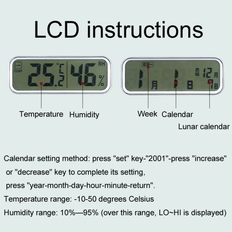 7. Humidity range: 10 percent —95 percent (more than this range, LO~HI is displayed)