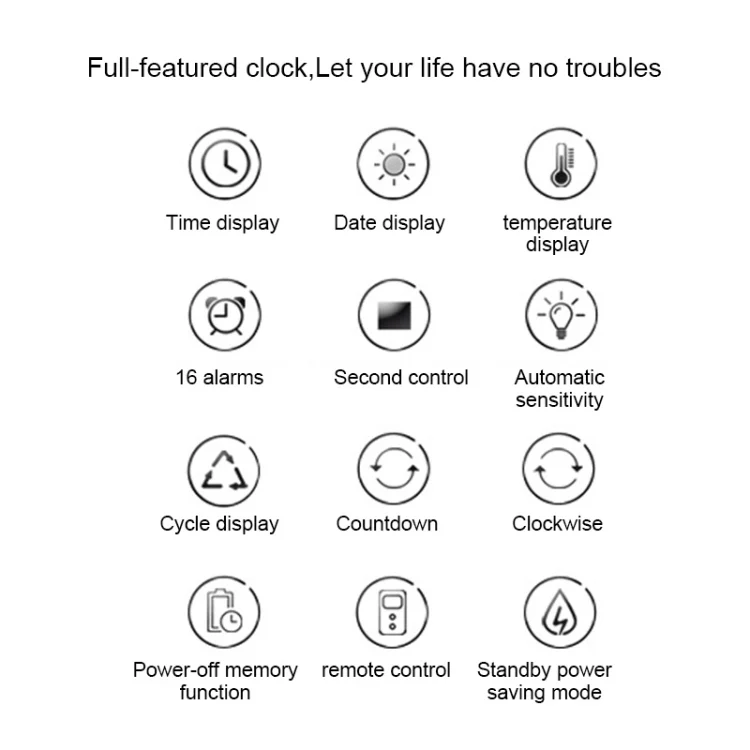 5. Functions: time, date, temperature, 16 groups of alarm clocks, countdown, countdown, auto-sensitivity, remote control of 20 meters (2 7th batteries need to be purchased by yourself)