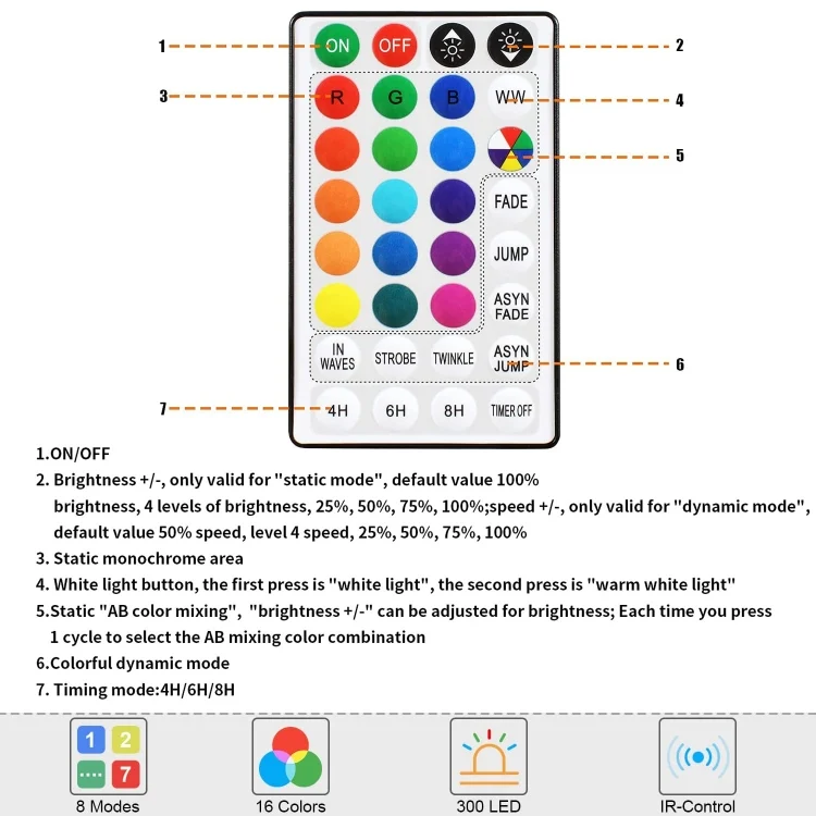 2. Effect: 16 static colors + 8 mixed colors + 4 flicker breaths + monochrome running water + mixed color running water + brightness/speed adjustment + timing function