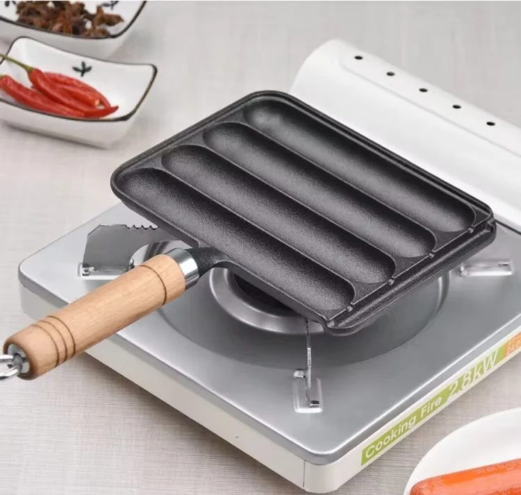 Cast Iron Grill Pan 4-Grid Non-Stick Sausage Grill Pan With Wood Handle