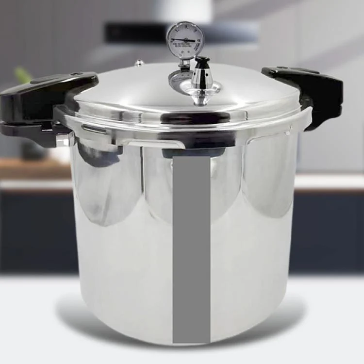 1. This commercial-grade 32cm/23L aluminum alloy pressure cooker features a built-in pressure gauge and universal compatibility with induction cooktops & open flames. Available in two models: Fixed 100kPa or 3 Adjustable Pressure Settings (35/70/100kPa).