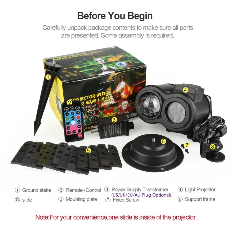 1. Function: dynamic/static/flashing, 2H/4H/6H automatic shutdown, changeable film patterns, different modes and color changes (single water pattern lamp/single projection lamp/water pattern+projection lamp)