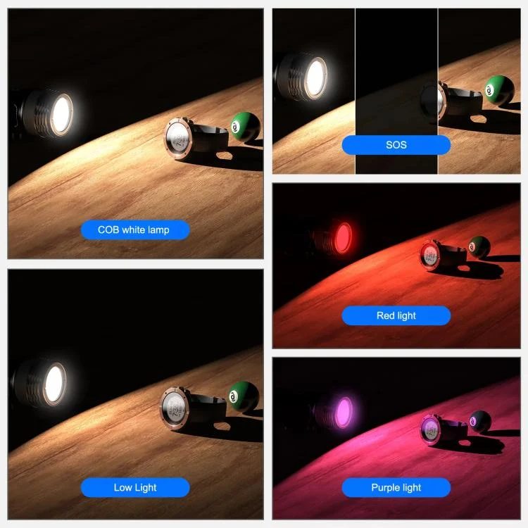 2. Multiple lighting modes, fiber optic flash/white light/red light/purple light/SOS, all-round fill light, knob infinitely adjusts brightness