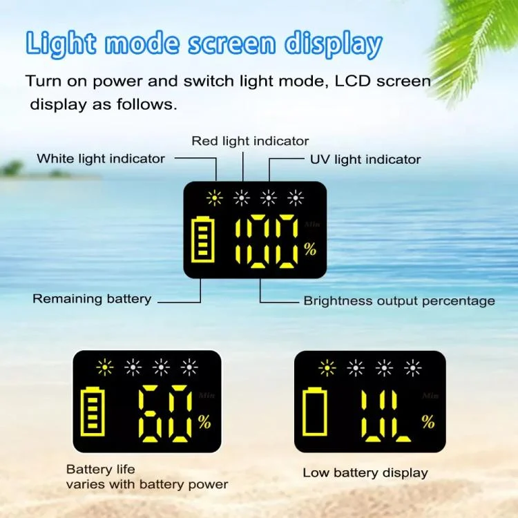 5. LED specifications: White light COB 60w (5000-6000K) x 1pc; Red light 3W x 4pcs; Purple light 3W x 4pcs
