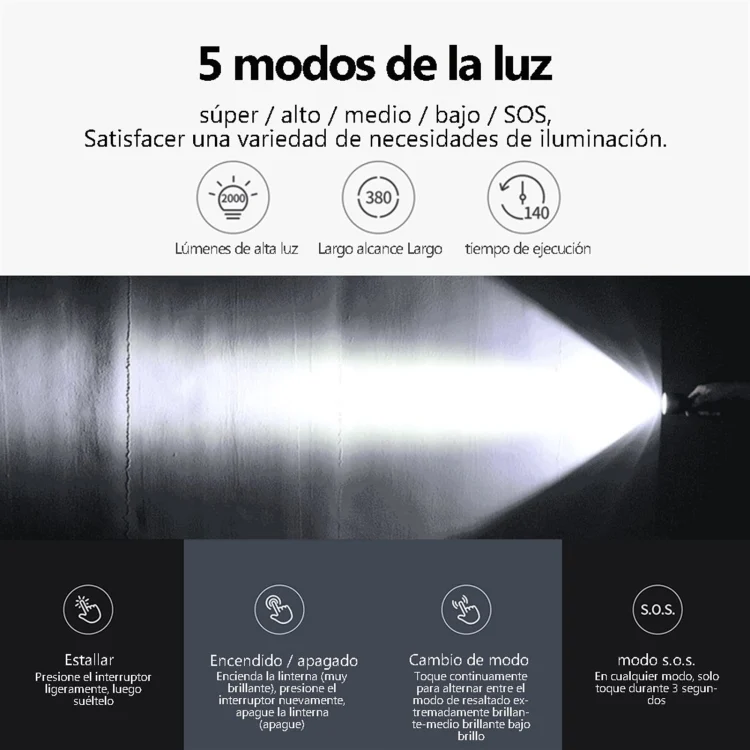 3. Multi-function side pressure switch design: a single switch realizes five switching modes (super high/high/medium/low/SOS), simple and easy to use, more convenient in use, heat dissipation line, extremely bright mode. After long-term use, it can still effectively dissipate heat and reduce the high temperature of the flashlight.