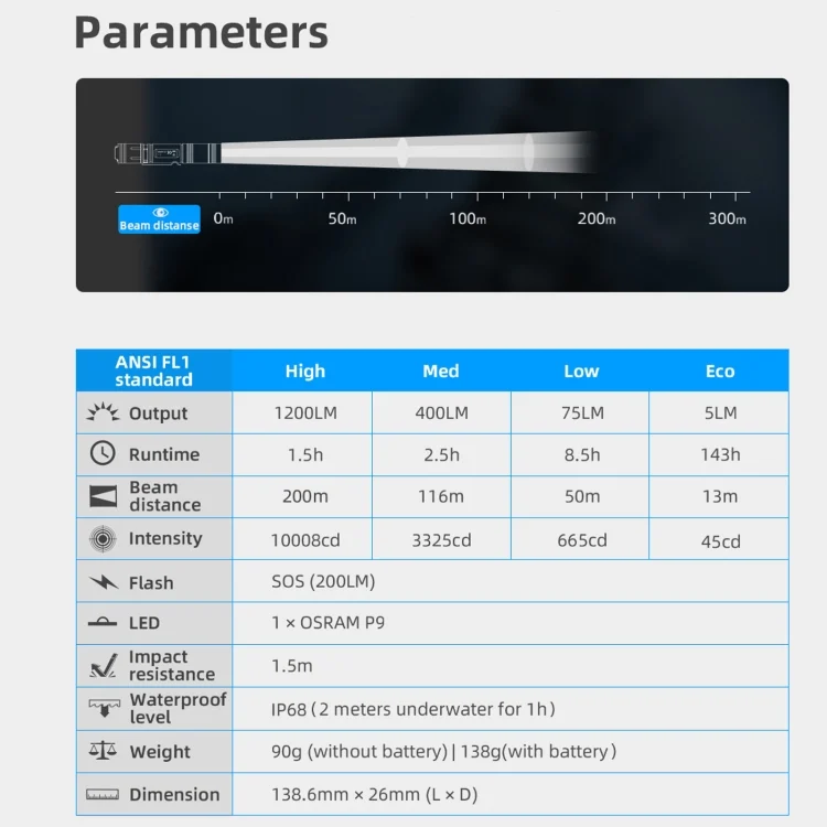 The flashlight has a low battery warning. In each mode, when the current battery is less than 30 minutes, the indicator light flashes 3 times.