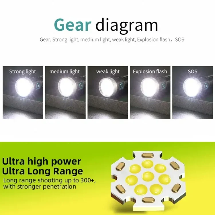9. Gear: strong light, medium light, low light, burst flash, SOS