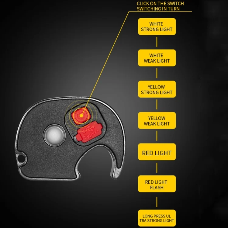 6. Lighting mode: white strong light, white weak light, yellow strong light, yellow weak light, red light, red light flashing, long press strong light