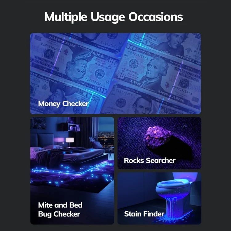 8. Usage: Fluorescent agent detection, banknote inspection, jade antique identification, stamp and bill anti-counterfeiting detection, UV glue curing, circuit board motherboard green oil curing, etc.