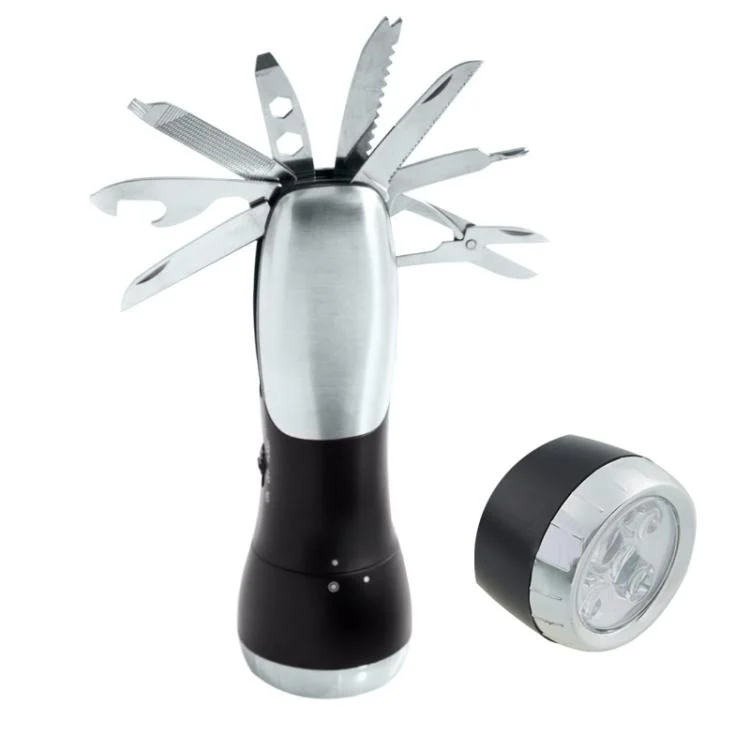 3. Includes scissors, a file, a flathead screwdriver, a Phillips screwdriver, a beer can opener, large and small nut runners, a sharp knife, a small and large scissors, and a nail driver.