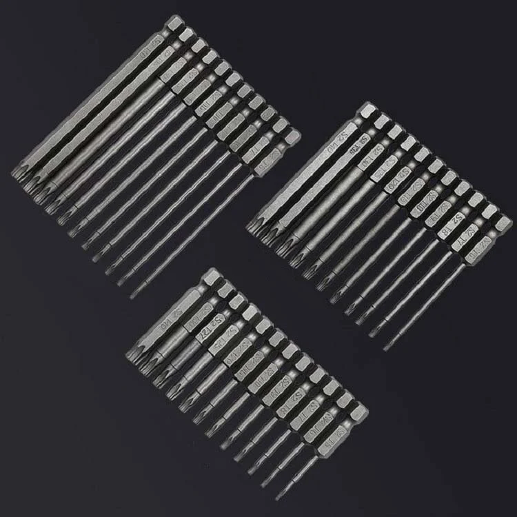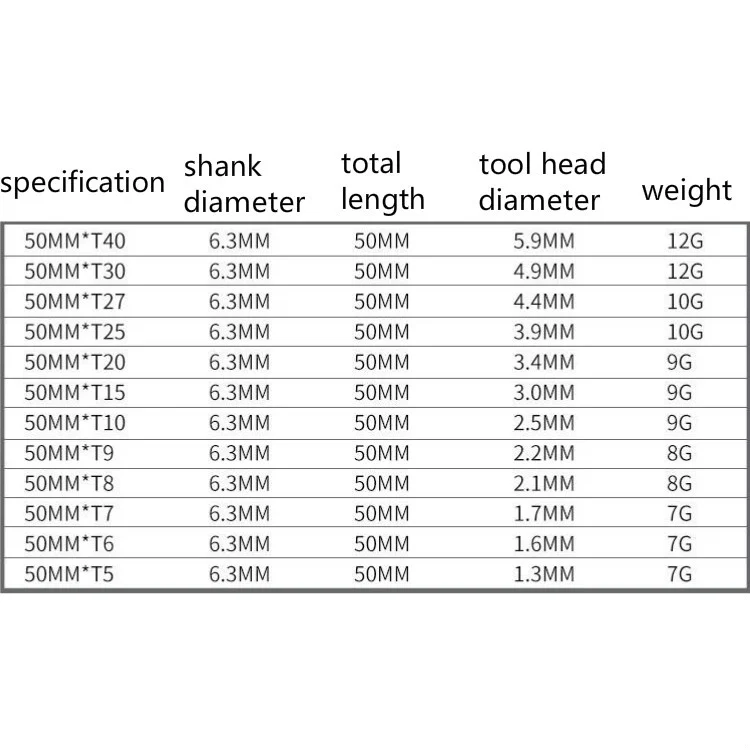 2. Specifications: 50mm including T5/T6/T7/T8/T9/T10/T15/T20/T25/T27/T30/T40, 75 mm and 100 mm including T6/T7/T8/T9/T10/T15/T20 /T25/T30/T35/T40, the diameter of the handle is 6.3 mm on both sides