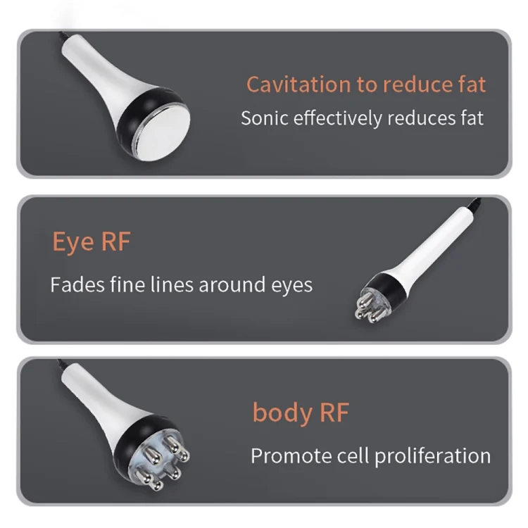 1. 40KHZ fat blasting head: the 40KHZ sound waves from the gathered strong sound wave fat blasting head enter the body, which can make the body’s fat cells produce a strong impact, which can effectively burn heat, water and fat cell blasting, so that the fat cells can be reduced, thus achieving the effect of fat removal.