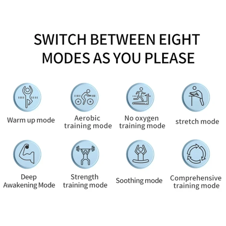 5. 12 modes of conversion, 20 levels of intensity adjustment (warm-up mode, deep awakening mode, aerobic training mode, relaxation mode, stretching mode, vitality mode, intensity training mode, enjoyment mode, rhythm mode, anaerobic training mode, Strength training mode, relaxation mode)