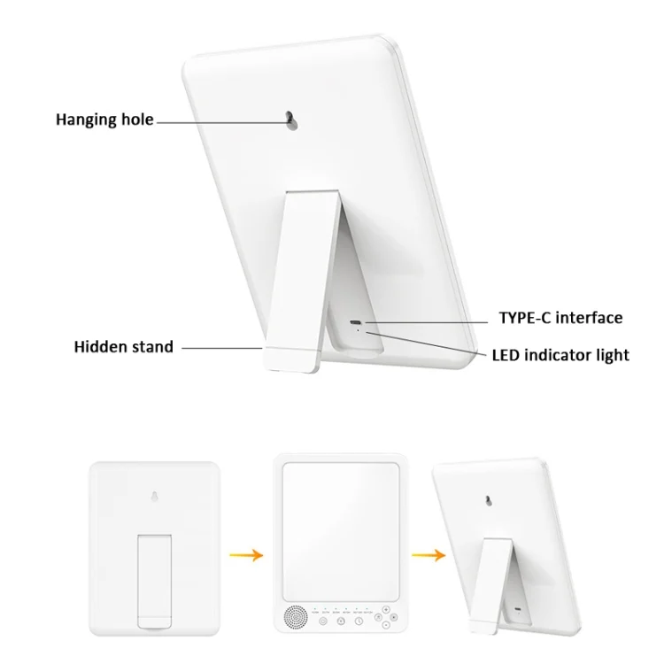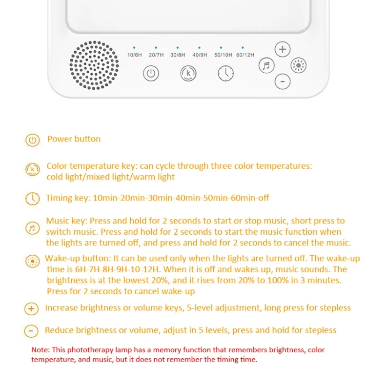 2. 3 color temperatures, 5 adjustable brightness and memory functions: The phototherapy lamp provides 3 color temperature modes (cool white/mixed/warm white) from 2800K to 6500K, 5 adjustable brightness levels, long press to control stepless adjustment Light, convenient memory function will remember all your previous settings for next time (color temperature, brightness, music)