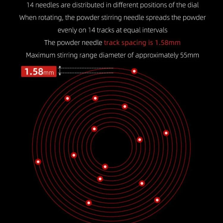 2. 14 churning needles are distributed in different positions on the needle plate, churning needles are equidistant when rotating in the 14 trajectories evenly dispersed powder, churning needle trajectory spacing of 1.58mm, churning the maximum range of powder diameter of about 55mm