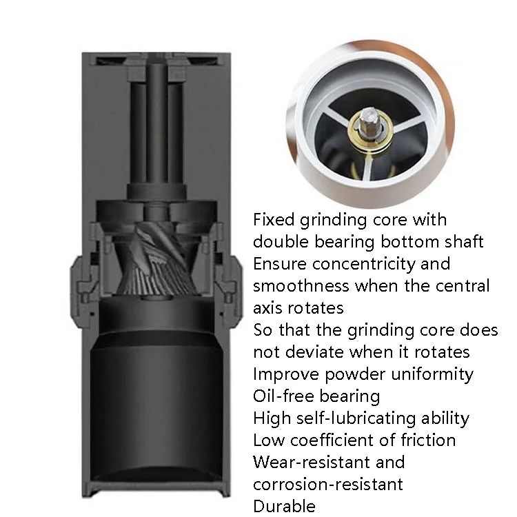 2. The double-bearing center shaft fixes the grinding core to ensure the concentricity and smoothness when the center shaft rotates, so that the grinding core does not deviate when it rotates, and the powder uniformity is improved.