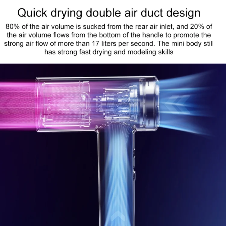 3. Quick-drying double air duct design, 80% of the air volume is sucked in from the rear air inlet, and 20% of the air volume flows in from the bottom of the handle, advancing over 17 liters of strong air flow per second.