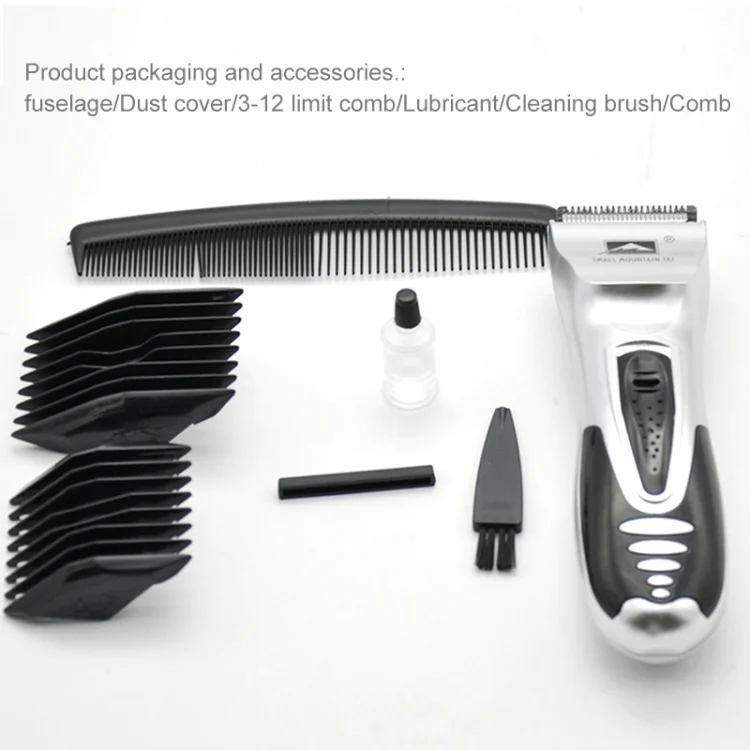 4.This package includes the machine itself, dust proof cover, comb, cleaning brush, lubricating oil, but without battery