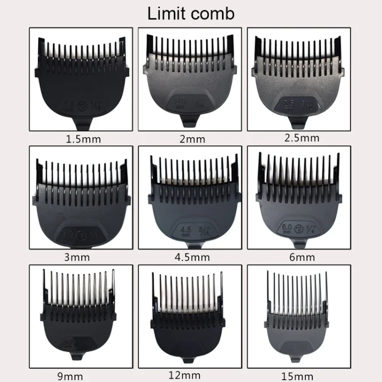 7. Products include: 1.5mm, 2mm, 2.5mm, 3mm, 4.5mm, 6mm, 9mm, 12mm, 15mm limit comb, small oil bottle, small brush, charging cable, instruction manual, hair clipper, cloth, sponge, pure steel tooth acissors, plain steel scissor