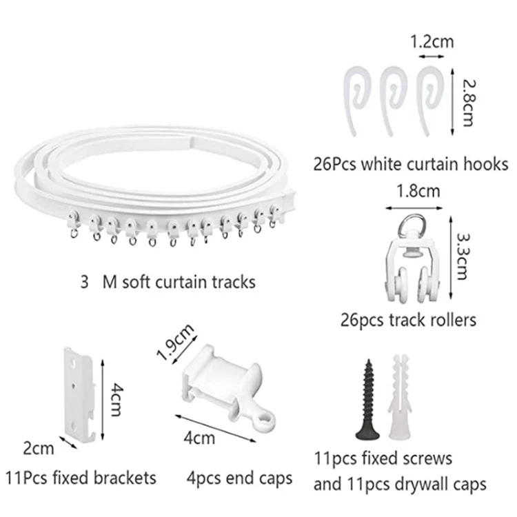 6. 3m suit: 3m curved rail, hook x 26, pulley x 26, top code x 11, screw x 11, expansion plug x 11, plug x 4, screwdriver x 1