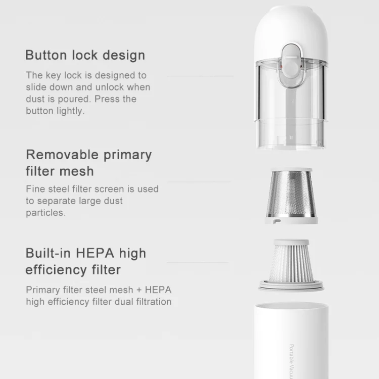 4. Using the button lock design, slide down to unlock when the dust is dumped, just press the button lightly