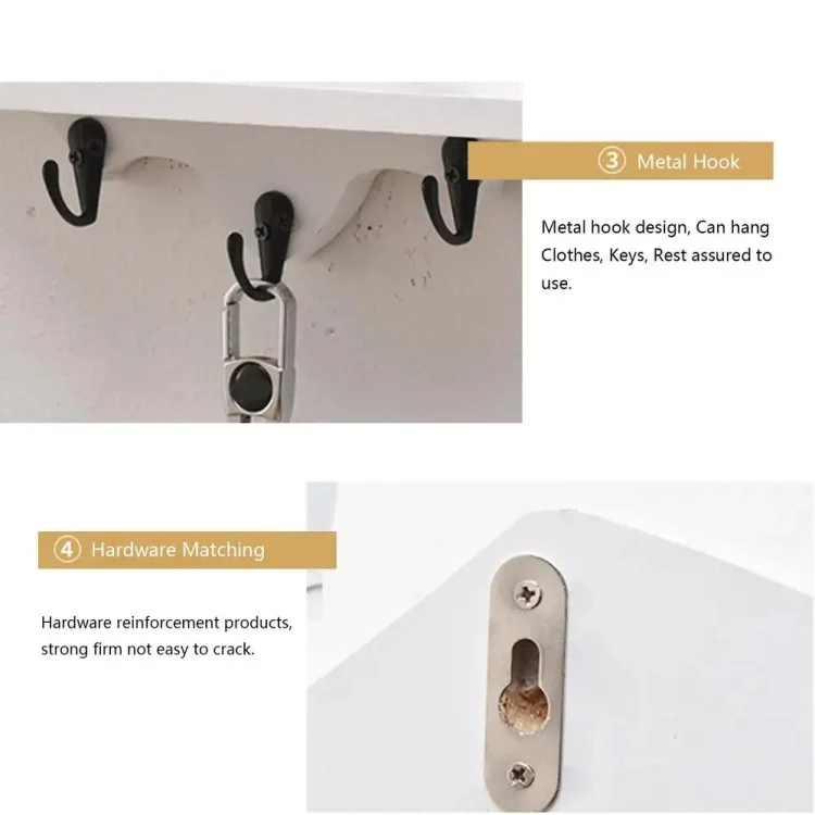 1. Overall creative design, the bottom hook design can be used to hang clothes, and the top partition design can be used to place decorations