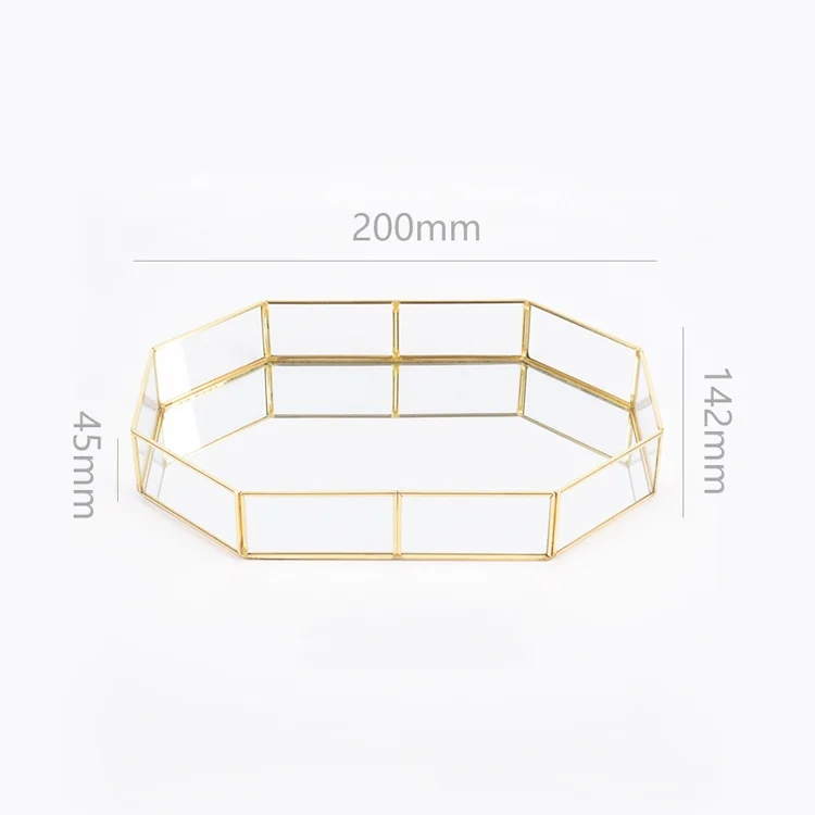 Glass Storage Tray Golden Retro Polygon Mirror Tray Brass Desktop Cosmetics Storage Tray