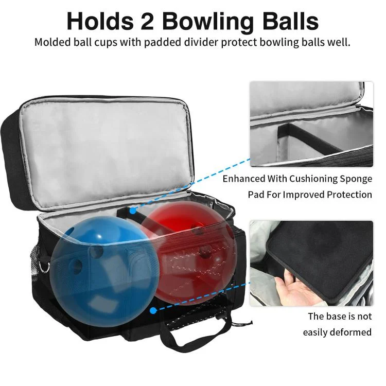 3. Top compartment for shoes, main compartment equipped with a wooden ball rack and padded dividers to protect your balls from damage and prevent them from rolling during transport