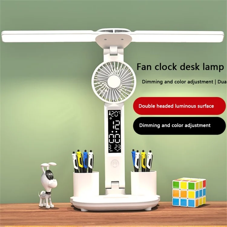 Double Head Lighting LED Fan Desk Lamp with Pen Holder & Clock